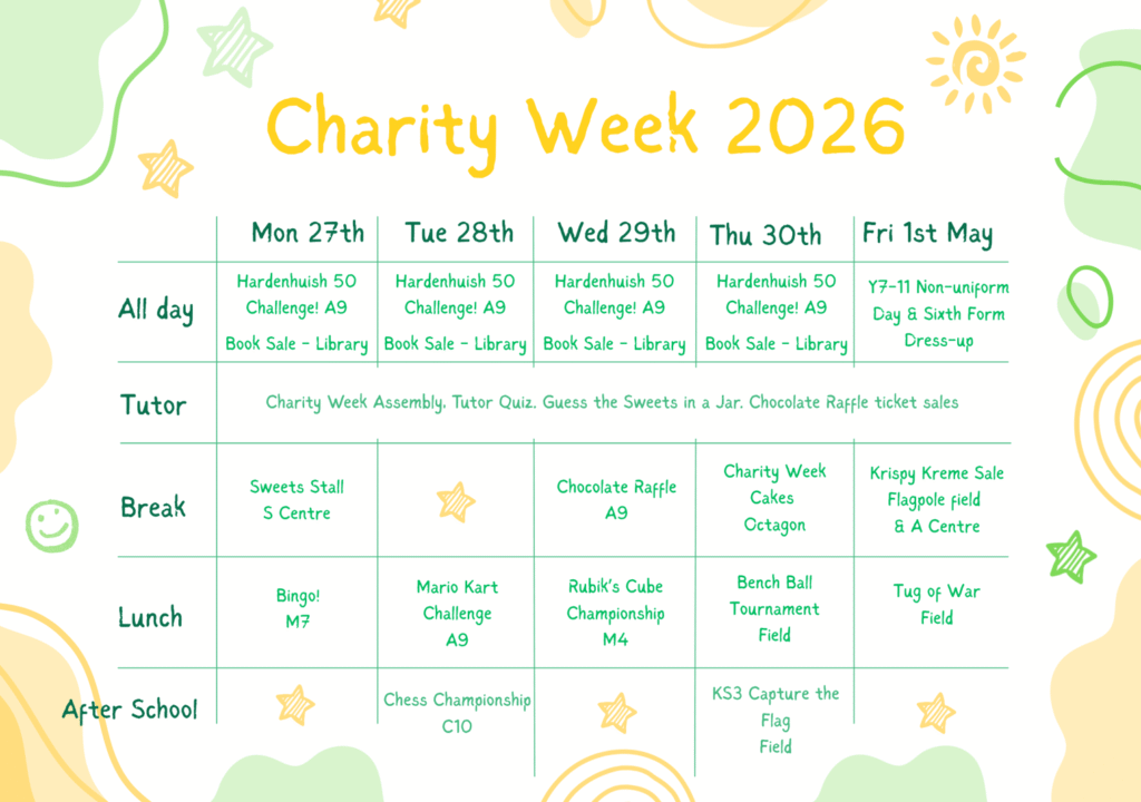 Charity Week takes place on the week commencing 27th April and promises to be a fun-filled week of activities. Throughout the week, the Student Leadership Team will be delivering assemblies and there will be quizzes and guess the sweets in the jar at tutor time. Pupils could take part in the Hardenhuish 50 Challenge, bingo, a chess tournament, or the Rubik’s Cube Championship. They could participate in tug-of-war, capture the flag, or the bench ball tournament. There will be lots of food on offer including a sweet stall, Krispy Kreme’s, Charity Week cookies & cakes, and the chance to win in our Chocolate Raffle! Additionally, there is a non-uniform day on Friday 1st May.